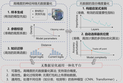 团队研发的高精度深度神经网络无数据量化方法,结合无数据场景的混合精度量化方法,无需任何数据即可达到与数据驱动的方法相当甚至更好的量化性能。并拓展无数据量化到多种视觉任务和模型结构,开发集成无数据量化通用一体化平台。