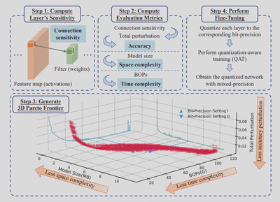 为了解决上述问题,我们提出了High-dimensional Trade-off Quantization(HTQ),如图2,它可以自动确定模型精度、空间复杂度和时间复杂度的高维空间中的最佳位精度,而不需要任何人工干预。具体来说,我们使用基于连接敏感性的显著性标准来表示量化后的精度扰动,其性能类似于Hessian信息,但可以快速计算(速度提高1000×以上)。然后,根据总扰动、模型大小和位操作(BOPs)的三维Pareto边界自动选择位精度,不需要人工约束。此外,HTQ允许对权重和激活进行联合优化,因此可以同时计算两者的位精度。与最先进的方法(如HAWQ-V3)相比,HTQ在图像分类和物体检测任务的各种模型架构上实现了更高的精度和更低的空间/时间复杂性。