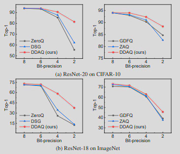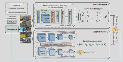 在本文中,我们提出了Dual-Discriminator Adversarial Quantization(DDAQ),这是一种新型的无数据量化框架,具有对抗性学习风格,能够有效地生成样本并学习量化模型,如图3所示。具体来说,我们在两个鉴别器指导下,采用一个生成器来产生有意义的和多样化的样本。两个鉴别器的目的分别是促进BN层分布的匹配和最大化全精度模型和量化模型之间的差异,如图4所示。此外,受混合精度量化的启发,即每层的重要性是不同的,我们在两个鉴别器引入了层的重要性,使我们能够更好地利用模型中的信息。随后,在全精度模型的监督下,用生成的样本训练量化的模型。我们针对不同的视觉任务,包括图像分类和物体检测,在不同的网络结构上对DDAQ进行了评估,实验结果表明DDAQ以良好的通用性超越了所有的基线方法,如图5所示。