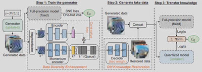 最近,无数据量化被广泛研究,因为它不访问原始数据集,可以解决广泛存在的数据隐私和安全问题。它的主要思想是根据全精度(FP)模型中的先验信息生成假数据,然后在FP模型的监督下用它们训练量化模型。量化性能在很大程度上依赖于生成数据的有效性,然而,现有的方法存在两个严重的问题:模式崩溃和灾难性遗忘,如图6所示,导致了非常显著的精度下降。