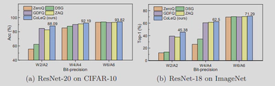 为此,我们提出 Contrastive Learning Quantization(CoLeQ),它通过对比学习实现了数据多样性的增强和旧知识的恢复,以解决上述问题,如图7所示。具体来说,我们在无数据量化中引入了MoCo范式,该范式可以维护一个编码特征的动态动量队列。对比学习的优化目标是通过促进生成的样本与前几批已经生成的样本的分离来提高数据多样性,从而缓解模式崩溃问题。此外,我们设计了一个捆绑权重的解码器,从队列中的编码特征中恢复以前的样本,而不需要额外的参数和训练,因此可以有效地防止灾难性的遗忘问题,如图8所示。为了评估CoLeQ的有效性,我们进行了大量的实验,结果表明与最先进的方法相比,CoLeQ具有一致的优势,如图9所示。